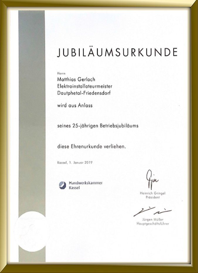 Am 08.10.1993 habe ich meine Meisterprüfung im Elektroinstallateur-handwerk abgelegt. Da Harry Müller krankheitsbedingt zum 31.12.1993 seinen Betrieb aufgeben musste, habe ich mich entschlossen zum 01.01.1994 einen Elektroinstallationsbetrieb in Friedensdorf zu eröffnen.