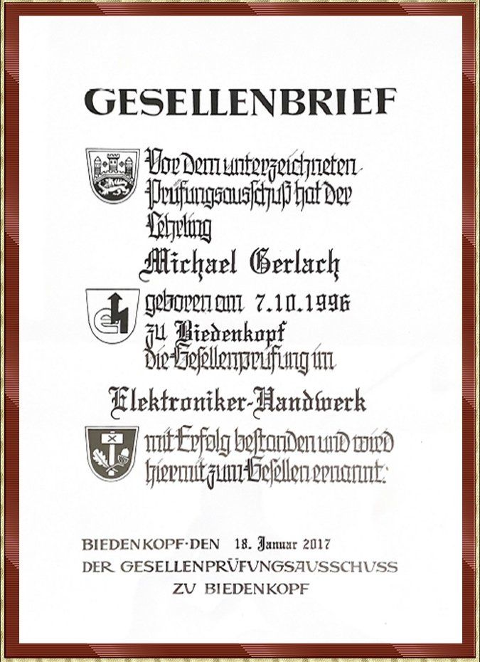 Am 01. Oktober 2017 habe ich meine Lehre zum Elektroniker, mit Fachrichtung Gebäudetechnik, im Ausbildungsbetrieb Elektroinstallation Matthias Gerlach begonnen und am 20. Januar 2021 erfolgreich abgeschlossen.