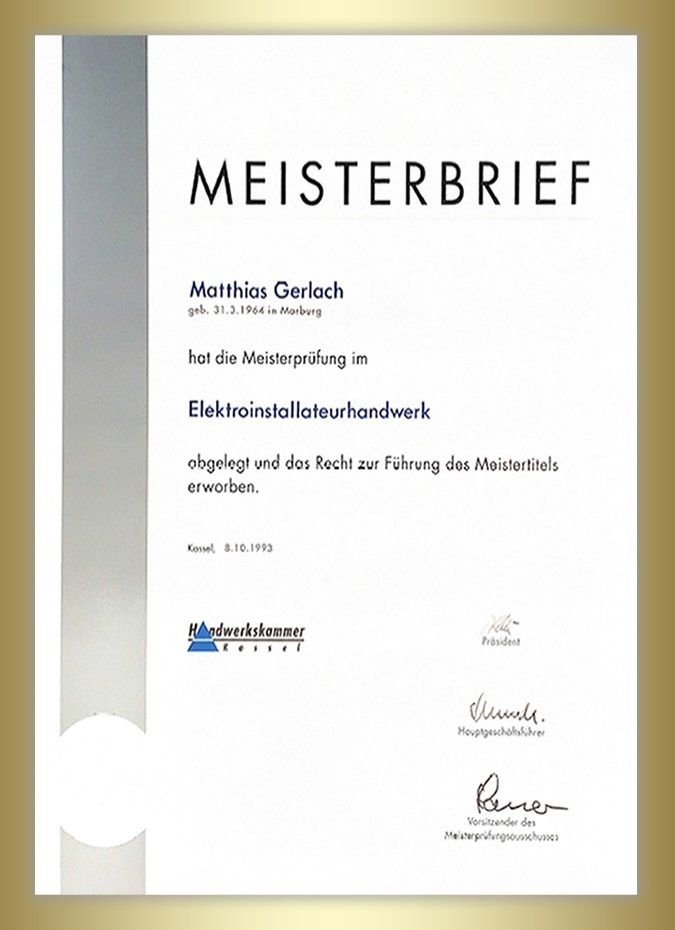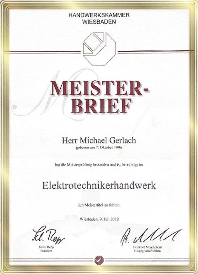 Nach meiner Lehre habe ich dann ab Juli 2017 die Meisterschule in Vollzeit besucht und am 09. Juli 2018 meinen Meisterbrief im Elektrotechnikerhandwerk erhalten.